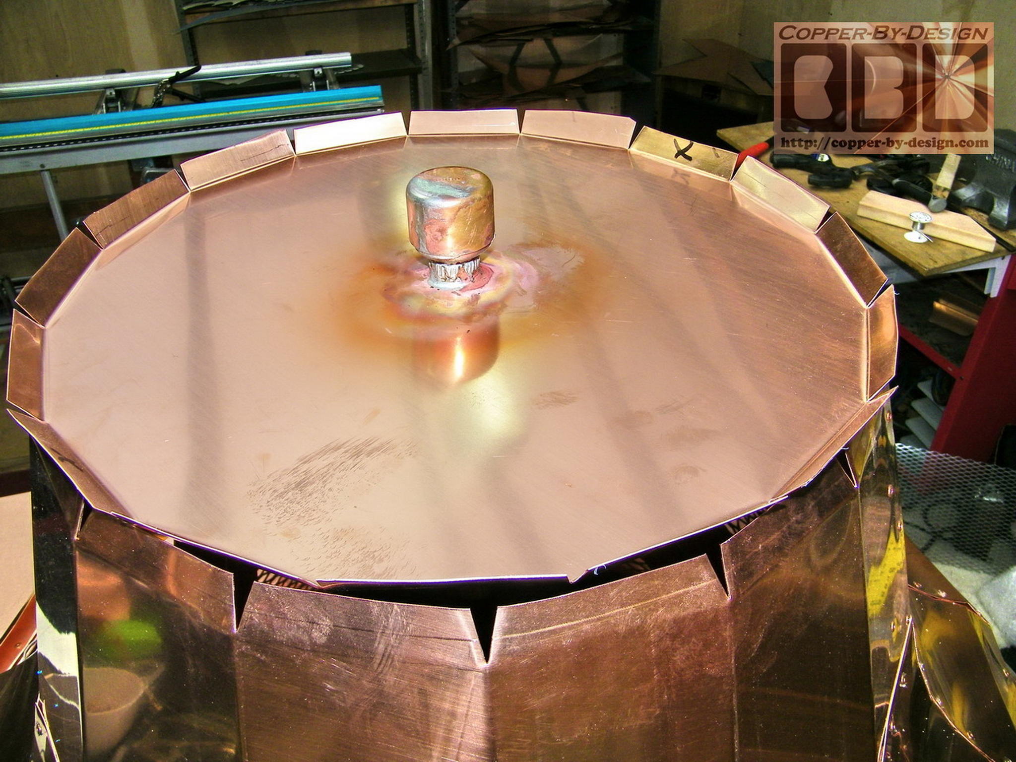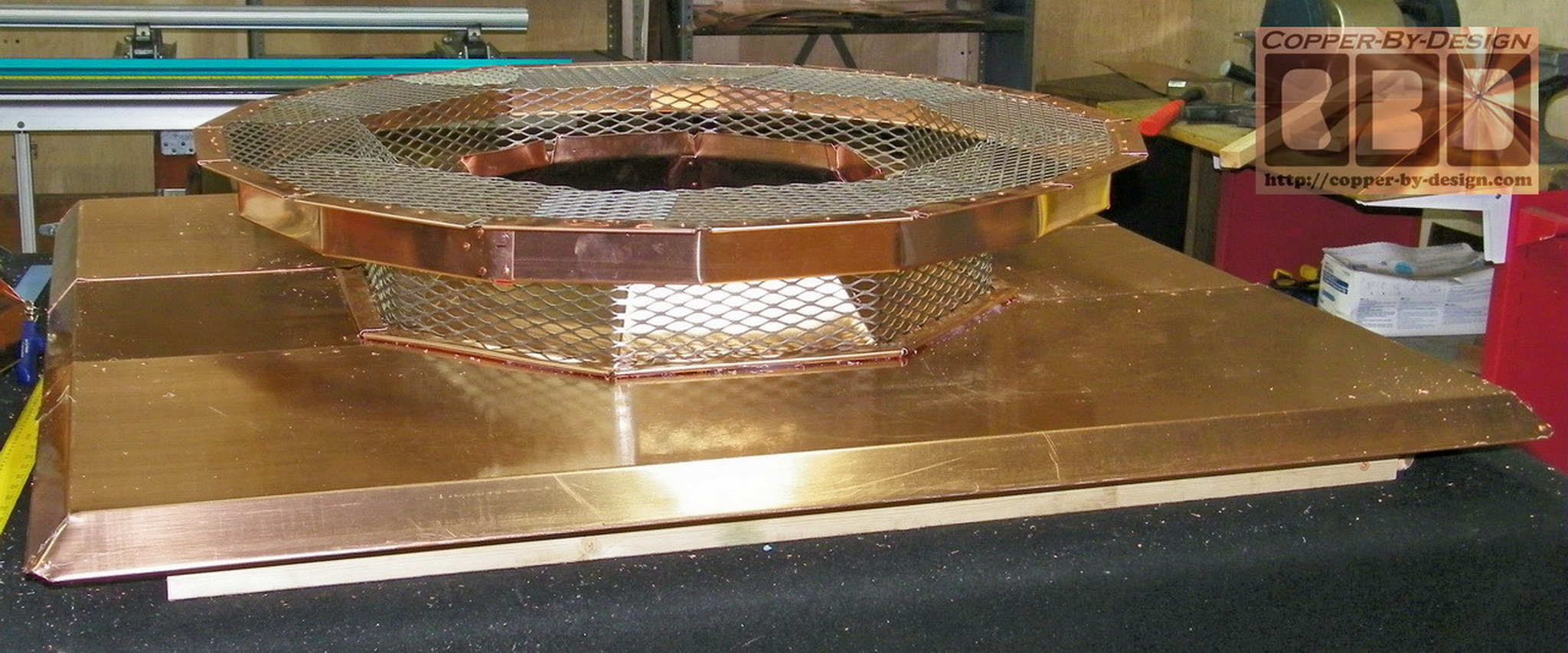 Covering the Base Pan w/copper: I needed to make this rain shield in the middle to surround the flue pipe. The 6" tall spark arrest screen vent area around this is made with a 16 gauge stainless steel expanded metal screen in an 8 sided unit that the whole bell will be supported over to look as if it is suspended above the pan 4", so this exhaust area was very limited. I needed to make sure there was enough exhaust vent area displacement, so I had to make the area horizontal as well to add more ventilation surface to this design. The client approved this design and has been very pleased with the results after seeing it in these photos I had sent as I built it. |