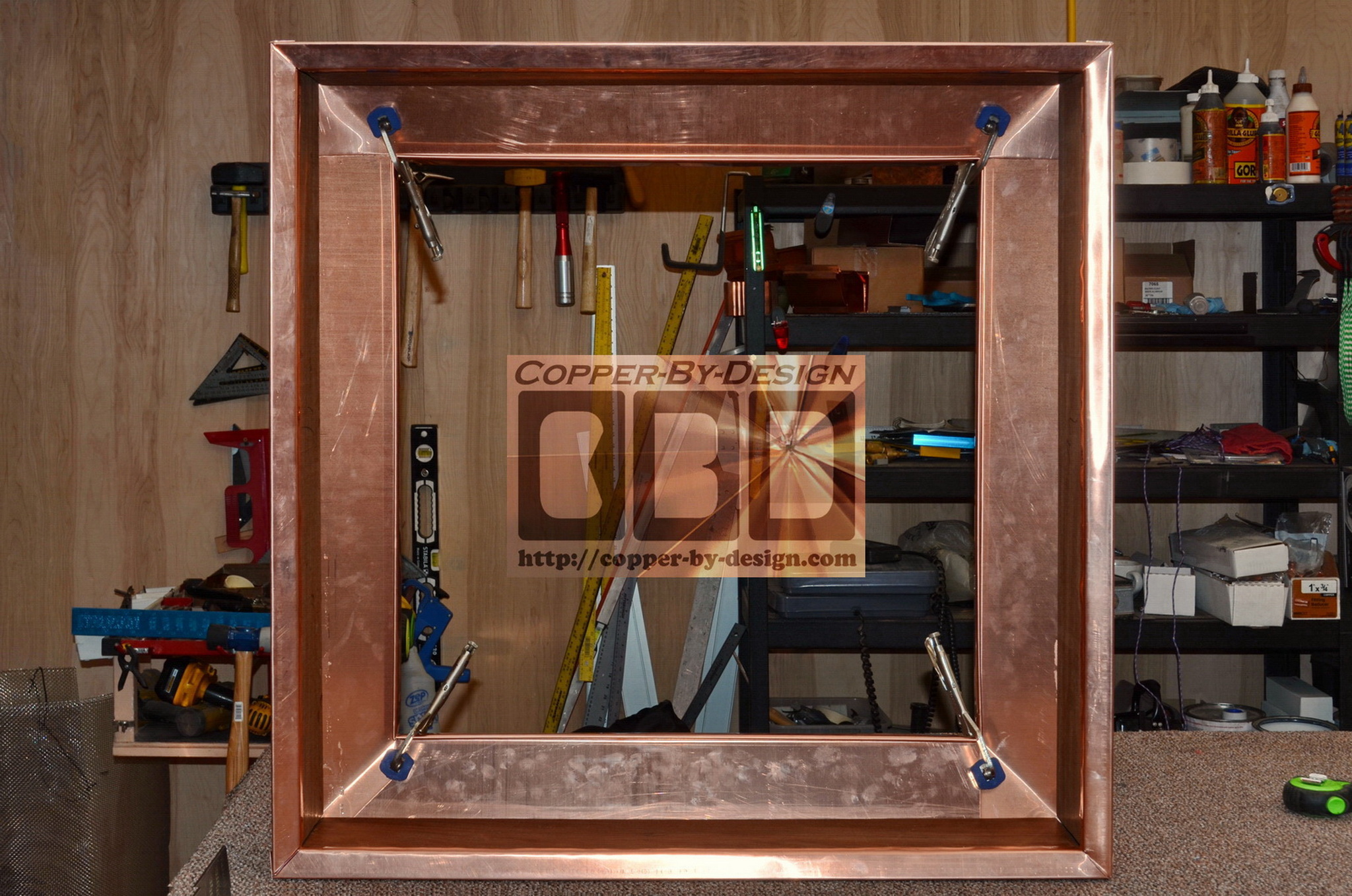 I used a 1/2" marine grade plywood for the back plate, which was glued and screwed together. A duel layer of 1/4" hardwood plywood was attached across the sides and front face to allow for the curvature with some bronze nails. Then this was covered with a 3 piece 32oz copper skin attached with an expanding polyurethane glue for a more solid feel and dent resistance. The outer rim had to be hammered down over the edges, because of the curvature in the outer face. Then another 58 over-sized industrial looking rivet are tediously attached with bronze nails. From: "Al Rossi" <AlR@rdfcpas.c*m> |