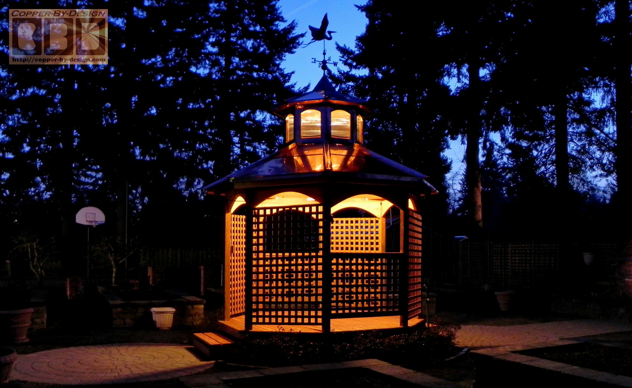 After making these clients a pair of copper chimney caps for their house a year prior, this project was to strengthen and reroof their old gazebo with 20oz copper. This was for Emil and Norma Bardana in Lake Oswego, Oregon. They wanted it rebuilt in my Tuscany arch style with a fancy lighted cupola. Sort of like I had done for our clients Cait and Charley Jabusch: I had taken this photo of their beautiful garden area back when I bid the chimney caps. I just suggested they could have me make them a small copper roof cap for their gazebo to hold their weathervane better, but it seems they wanted a whole lot more. I was surprised to hear a year later they wanted the whole gazebo covered with copper and make them a cupola as well. We discussed different sizes and I made them a scaled diagram to show what is would look like. They again placed a lot of trust in me to meet or exceed their expectations with this project. This was the coolest Tuscany arch style copper project I've worked on to date. They had first contacted me 6/12/09 and then again on 6/20/10 to discuss this second major project they were now ready for, so we swiftly worked out the details of this project on site with a personal visit to their lovely garden space again to get measurements, so I could provide them with a firm quote to do this work. Given the width of over 11', I came up with the recommendation of a 4' wide by 2' high cupola with a 5' wide roof over that to offer it a 6" eave out past the arches. Knowing they were not looking for a cupola so big a person can sit up inside it, like the Jabusch gazebo, this was substantial enough, but should not seem too large. I ended up adding 3" to the width of the cupola roof, and about 6" to the width of the lower roof plus the new copper gutter. The cupola roof line is designed to match the roof line of the main gazebo roof: 6/12 pitch, so this will look more like what the architect might have designed for this gazebo, had he designed a cupola for it. The client approved this design and were very pleased with the results. We discussed aesthetic options, like adding the arched detail to the gazebo below the roof, which also added a good deal of stability to the gazebo structure, so it was less wobbly up there. Here's the new plywood being attached with 2.5" deck screws after I had cut out the center of the roof joists to install this support ring for a 36" open gap in the middle. It only took a few minutes to get this set over the gazebo. It's amazing what can be done with the right equipment. The cupola needed to be centered and bolted down with the 6" lag screws before they can be custom fitted and sealed to the corners of the cupola. The inside of the gazebo was a bit rustic looking, so I gave the clients the option to have me install a nice hardwood plywood soffit up inside. I knew with all the odd angles for each side I was not going to get these fitted perfectly, so I added some 1/2" copper piping over each seams for a very clean look. I was able to hide most of the new wiring under the floor and up in the rafters above the new soffit. The soft LED lights in the cupola are on a timer that turns them on at dusk and off 6 hours later. It also has a wireless remote control, as well as a separate light switch down below. The 12" globe has a 18 watt LED bulb that equals a 150 watt incandescent, and has it's own switch near the entry. The support pipe in the top of the cupola had to be set vertically level, so their Blue Heron shaped weathervane would rotate properly in the wind before the steeple cone could be locked down. You can see the 2.5" wide vent holes in the roof of the cupola to release the heat that would build up inside in the Summer months. It is screened with stainless steel mesh. |
