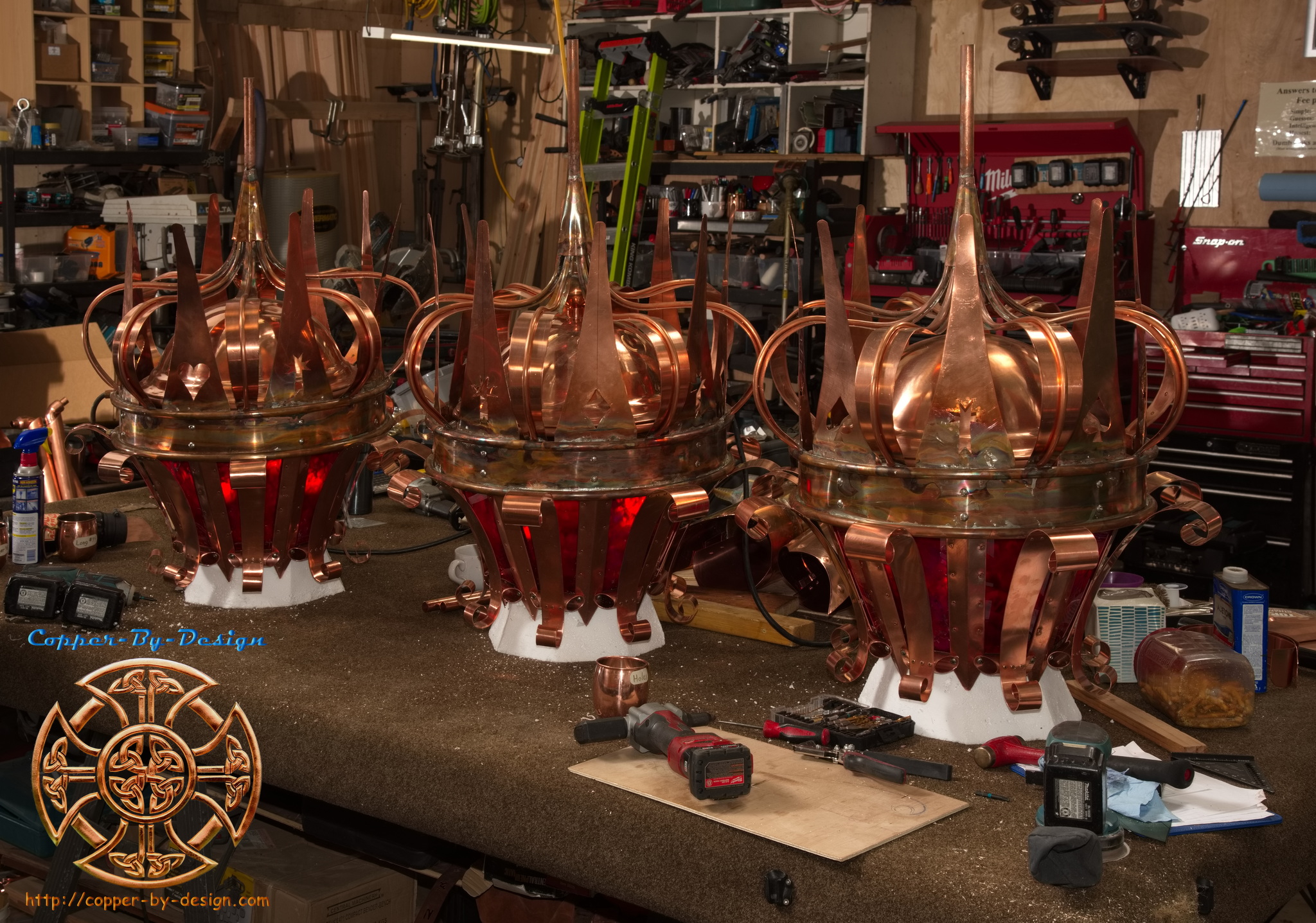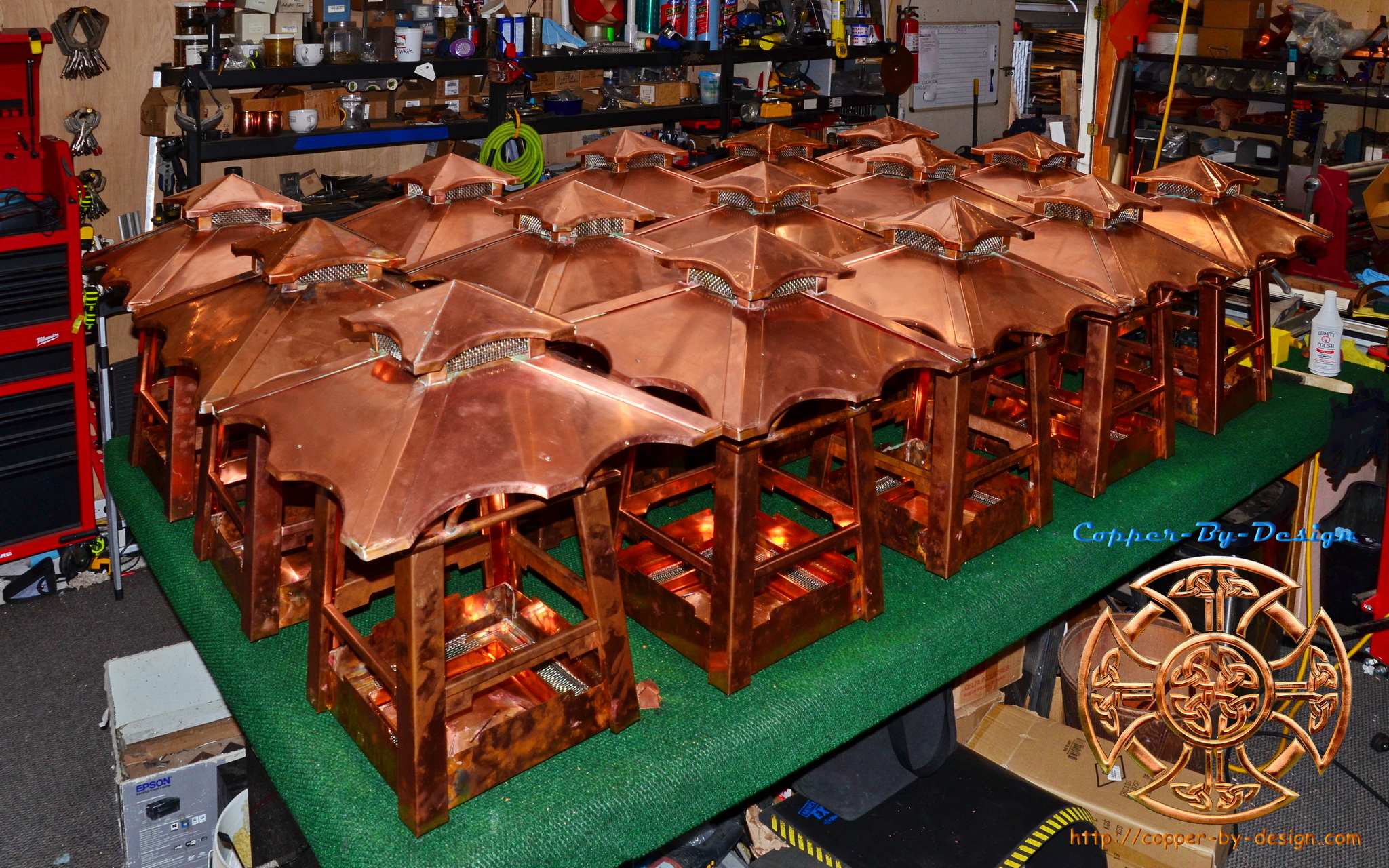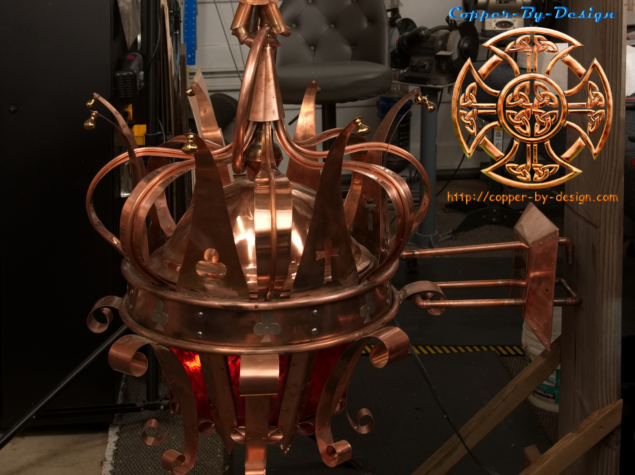| This was a collaborative design with my Client Craig Nicholson in Columbus, Ohio. They first had us to build 16 larger lanterns to be mounted on top of their columns. Then another 14 smaller lanterns for wall mounting. Each lantern has 65 pieces in their construction, plus dozens of rivets and 8 bronze nails. Then there is this multi flame burner. For this whole 30 lantern project this took 1,950 individual copper and stainless steel screen parts needing to be custom formed and assembled. So, even along with the 4 shipments this whole project at the cost of $37.5k total comes to just $19.23 average per piece designed, assembled, and delivered. This 30 lantern project took us about 16 months to design and complete along with delays for the client's schedule. There was over 5 months of full time work put into these. They will be adding the stained glass windows there on site and making special braces for the wall mounted lanterns. |