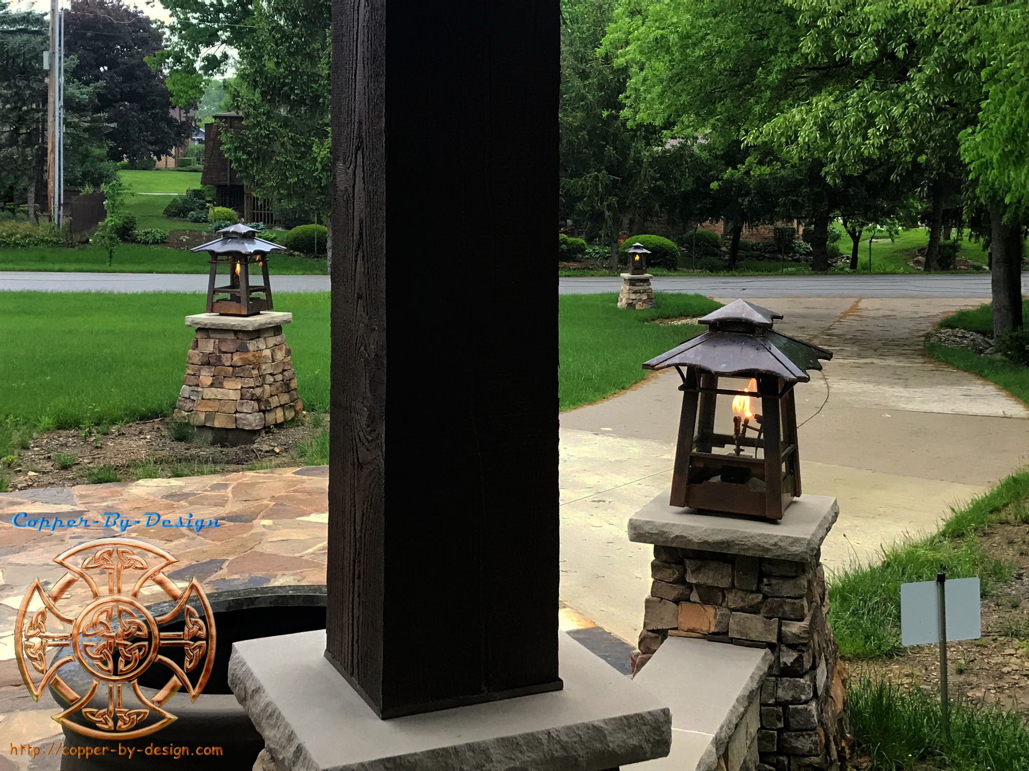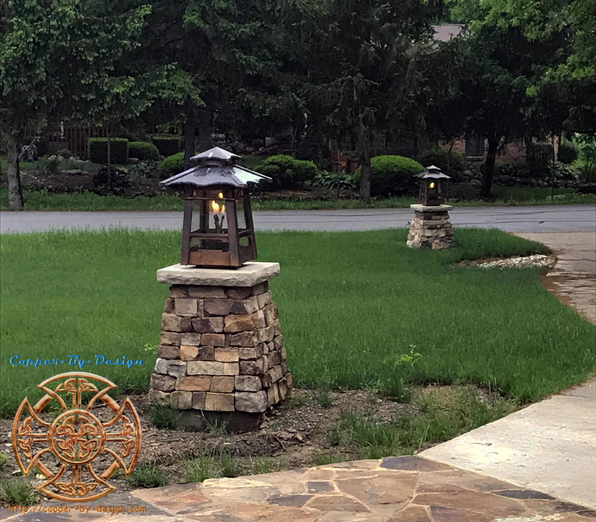 | These lamp post toppers were for a past client Atom Larsen in Sandy Oregon, to cover the entry gate columns. We had replaced their gutters with copper, made them a pair of chimney caps, a fire pit cover, roof flashing, and a vented ridge. |