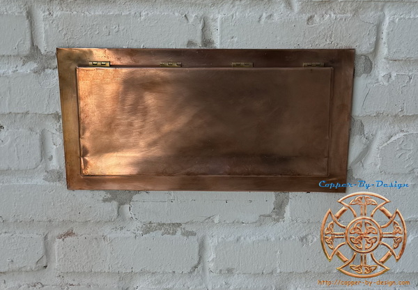 This is a security mailbox I had made for myself (11-03) and still in use to this day. I built this wood frame with 3/4" birch plywood for dent resistance (boys will be boys), covered in 20oz copper. This shows some different versatile kind of design and fabrication work I can do. This could be made in different sizes and shapes to suit your personal desire. This security mailbox was built 13" wide, 20" deep, and 19" tall to the tip of the roof, These days this would run about $4k to $5k with shipping.